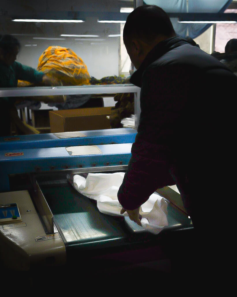 中国青島の自社工場にて、縫製~加工の一貫生産を行っています。国内生産背景も有ります。